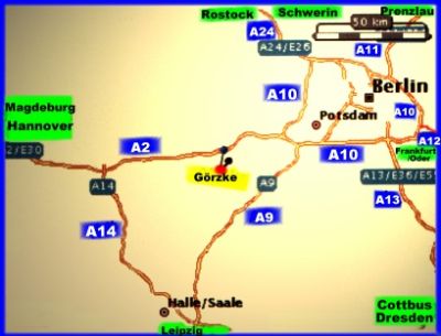 Aus Richtung Magdeburg / Hanover kommend befahren sie die A 2. Sie können hier bereits die Autobahnausfahrt - Ziesar - abfahren. Dann fahren Sie Richtung Ziesar / Brandenburg weiter, noch in Ziesar biegen Sie rechts ab Richtung Wiesenburg auf die B 107. Diese befahren Sie weiter über Köpernitz - Buckau - Rottstock bis Görzke.