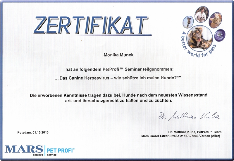 Die Lizensierung durch den VDH mittels Zertifikat und der dazugehörigen Plakette, bietet der VDH den im VDH organisierten Züchtern seit 2008 kostenpflichtig zum Kauf Jahr für Jahr erneut an. Dieses Züchterpaket habe ich bis 2015 Jahr für Jahr gekauft, um dann doch festzustellen, dass es im Grunde überflüssig ist. Selbstverständlich bin ich seit der Wende 1989 im VDH organisiert und meine Hunde bekommen auch seit dieser Zeit VDH/FCI Papiere über der CfBrH. Auch in der ehemaligen DDR habe ich in der Sektion Dienst und Gebrauchshundeorganisation Spezialzuchtgemeinschaft Collie, Sheltie, Bobtail meine Collie's mit anerkannten Papieren gezüchtet, die dann nach der Wende in den Cub für Britische Hütehunde übenommen wurden.